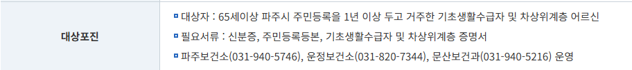 - 대상: 파주시에 1년 이상 거주한 만 65세 이상 기초생활수급자 및 차상위계층